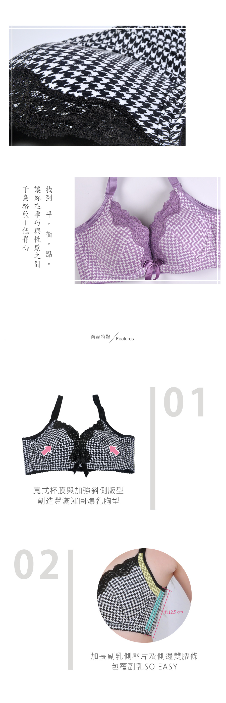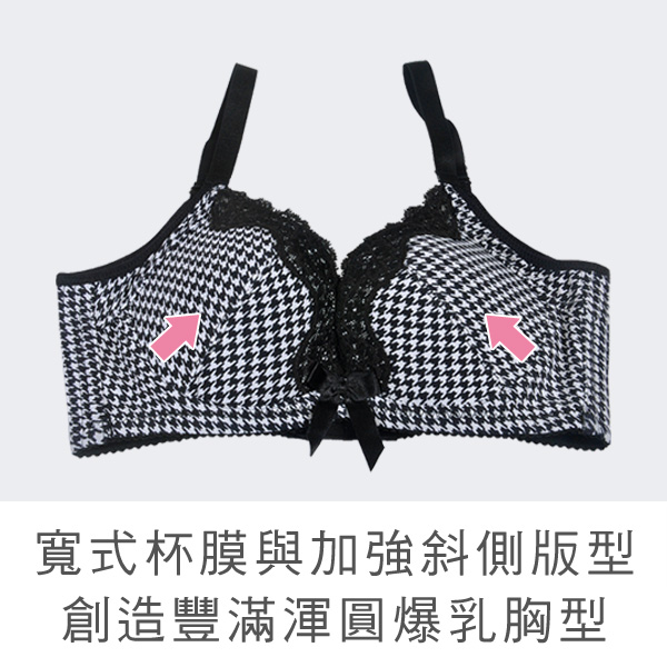 ★玉如阿姨隆重推出這款,兼具爆乳/機能/全包/美型的一款內衣! ★外型布料採用千鳥格紋,經典不敗的花色,讓人愛不釋手 ★內衣爆乳效果很好,採用斜側壓杯模,將胸部完全往中間集中 ★內裡下厚上薄Q棉,整個往上提高1.5公分,將胸線往上拉提 ★低脊心,胸前滾邊蕾絲設計,穿上搭配深邃事業線,更加性感 ★整件內衣在腋下的地方採用全包式設計,現代女性內衣新趨勢 ★副乳側壓片/脅邊加高/後面背心式美背加高至19公分以上 ★你千萬不要錯過喔!玉如阿姨強力推薦款~ ★台灣製造,品質保證