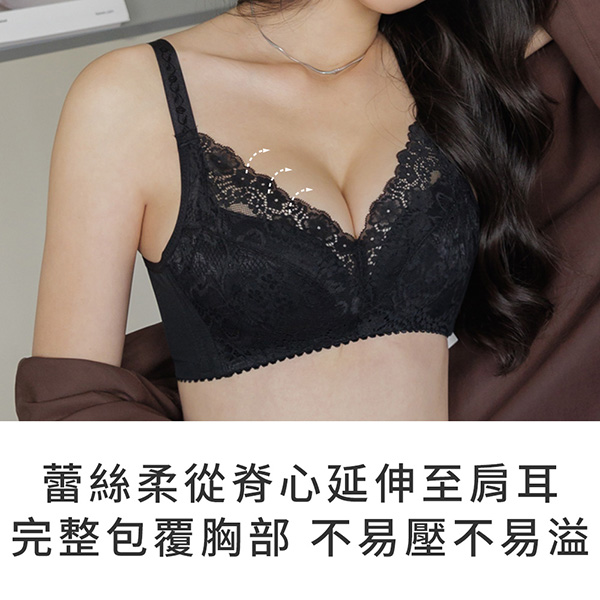 ★蕾絲從脊心延伸至肩耳做V剪裁,給胸部一個安穩的家