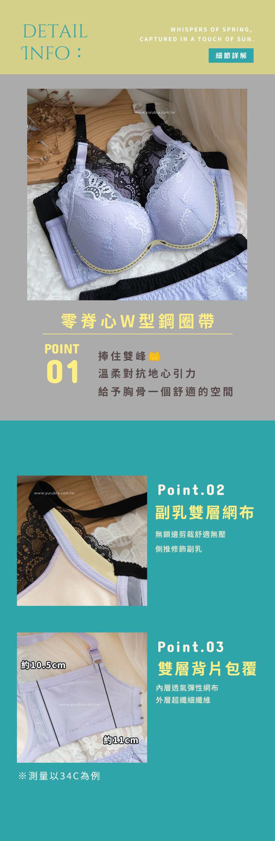 ★蕾絲圓潤流暢的線條,飛舞在胸前,曼妙迷人! ★零脊心鋼圈帶,讓胸骨不感壓迫 ★L型塑型軟鋼圈,側推防外擴 ★無鎖邊副乳雙層網布,舒適修飾! ★深邃V型蕾絲剪裁,服貼胸部曲線,不易簍空 ★B罩下厚上薄,讓上胸更顯飽滿 ★雙層背片,內透氣網布,外超細纖維,柔軟撫平背部 ★台灣製造,品質保證