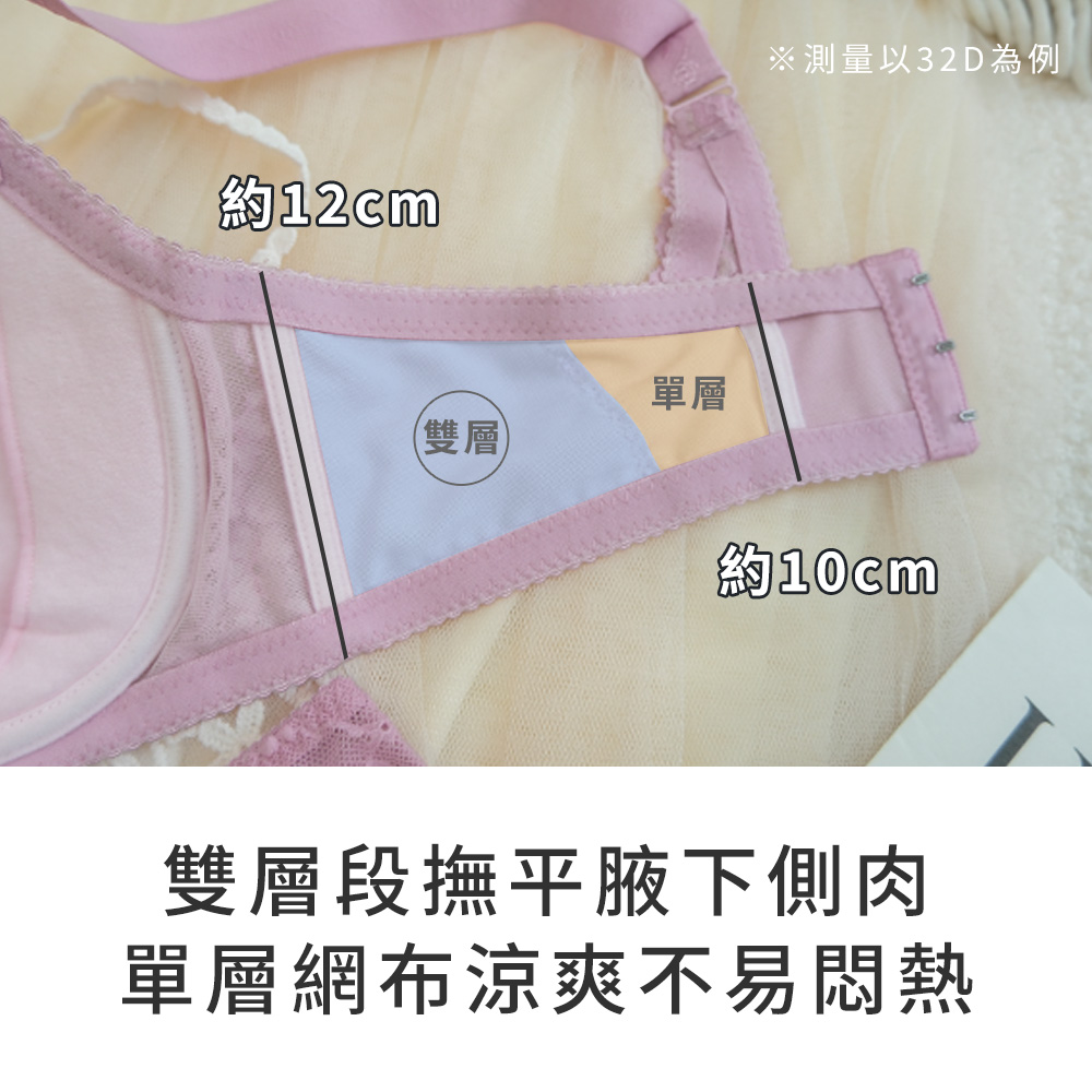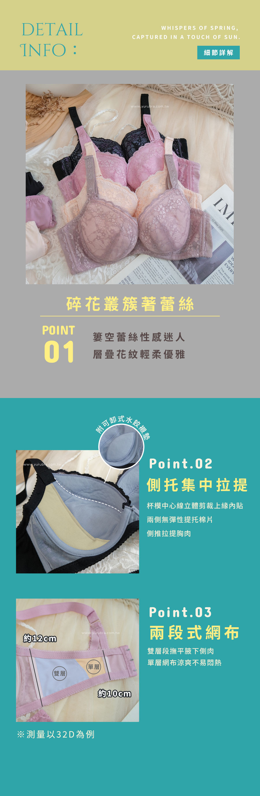 ★碎花叢簇著的蕾絲,優雅耐看 ★杯模中心線托提剪裁,上緣內貼,打造集中立體澎澎胸 ★兩側採用無彈性提托棉片,側托拉提胸肉 ★側背片做兩段式網布設計: ①雙層段撫平腋下側肉 ②後背的單層網布涼爽不悶熱 ★肩帶與背片連接處的棉條設計,能加強穩定不易跑位 ★後背的肩帶做蕾絲特殊設計,像兩片小翅膀一樣的俏皮可愛 ★美背肩帶加上三排扣 ,著舒適穩定 ★台灣製造,品質保證