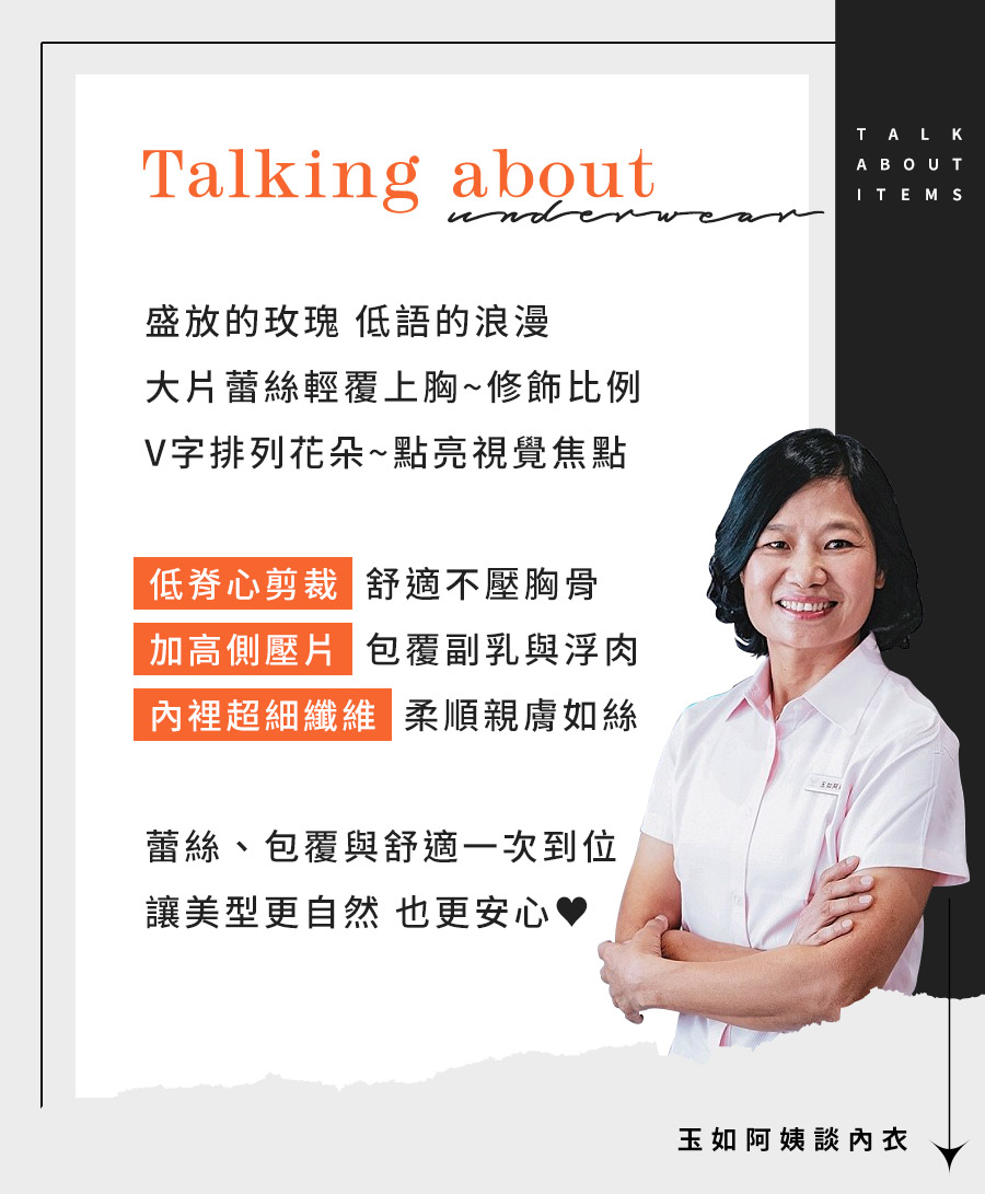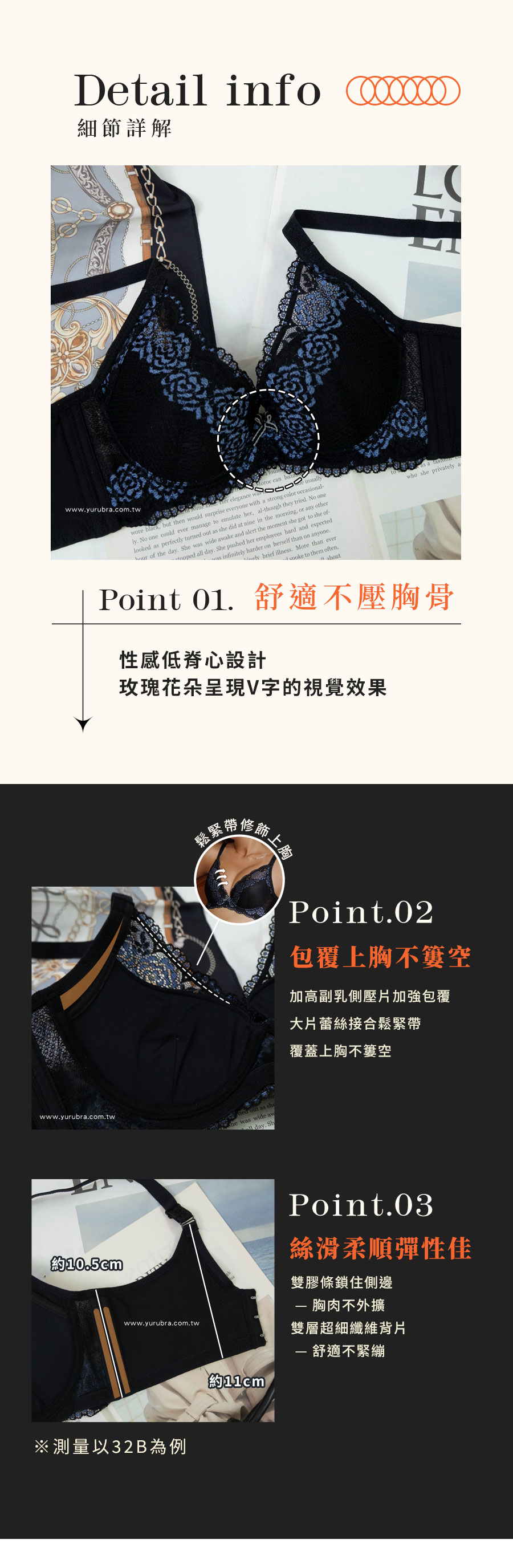 ★朵朵豐盈的玫瑰花朵,呈現V字的排列,視覺上更搶眼亮麗 ★大片蕾絲接合鬆緊帶,覆蓋上胸不易簍空,還可修飾大小胸 ★低脊心設計,穿著舒適不壓胸骨,可愛蝴蝶緞帶藏在雙峰之間 ★A、B罩下厚約2.5CM,神隊友助攻托高更飽滿 ★加高的副乳側壓片,更完整包覆腋下贅肉 ★杯模內裡採超細纖維布,給妳絲滑柔順的親膚體驗 ★雙拼膠條設計,鎖住側邊胸肉肉不往外擴 ★雙層超細纖維背片,裡外絲滑柔順 ★背片彈性佳,穿著舒適不緊繃 ★U型美背設計,三排三扣穿著更穩定 ★台灣製造,品質保證