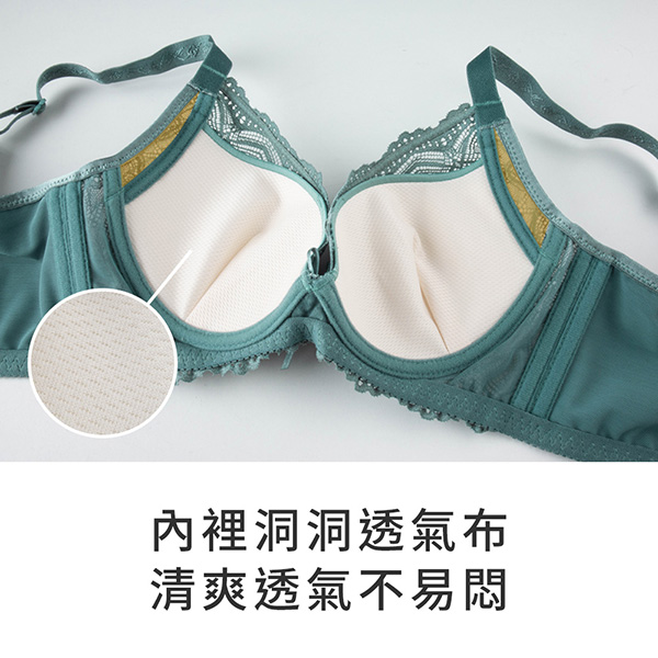 ★蕾絲優雅顏色飽和,耐看耐穿不敗款,是妳最契合的伴侶! ★杯型穿起來呈現渾圓內貼 ★低脊心極度好穿不壓胸 ★J型中軟鋼圈叫妳舒適美麗又穩定 ★杯裡洞洞透氣布,穿得清爽舒適 ★副乳側壓片,能包覆及側推肉肉 ★腋下雙膠條設計,穩定撫平腋下肉肉 ★雙層背片穿著服貼舒適,穩定包覆側背曲線 ★U型美背設計,讓妳包覆又穩定 ★台灣製造,品質保證