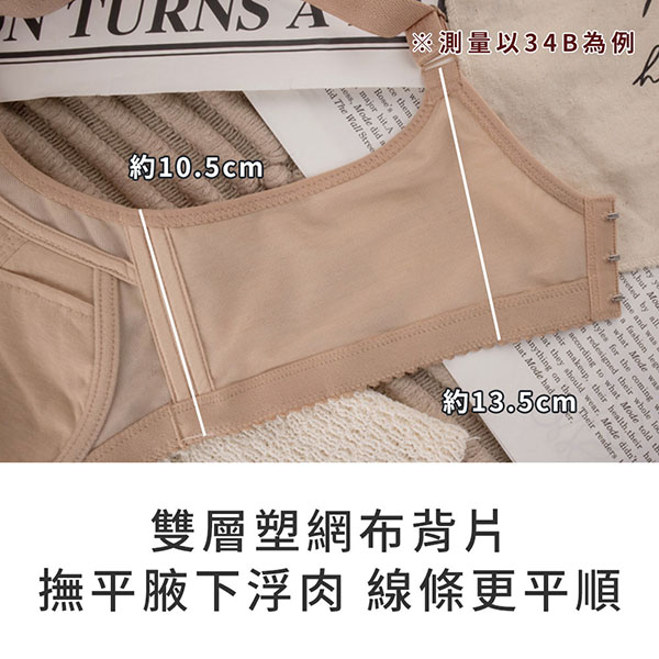 ★脊心、兩側及副乳裡布採無彈力透氣網布,穿著穩定