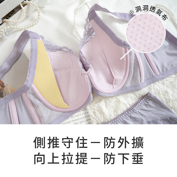 ★大罩杯全面再舒適!透氣親膚~ ★色調柔和清晰,如在清晨的露臺,陽光灑在蕾絲上的通透感 ★4/5罩+C型軟鋼圈,包覆托高防下垂,舒適打造美胸 ★內裡洞洞涼感透氣布料,讓你的胸部如徜徉在雲上~ ★無彈棉內提托片連接肩帶,胸型上提又集中 ★加寬約2.3CM肩帶,不只分散肩膀壓力更能加強拉提力道 ★分離式雙膠條設計,前穩定後推進,側邊曲線更美麗 ★外層塑網布×內層透氣涼爽布,穩定之餘更添一分清盈涼爽 ★台灣製造,品質保證