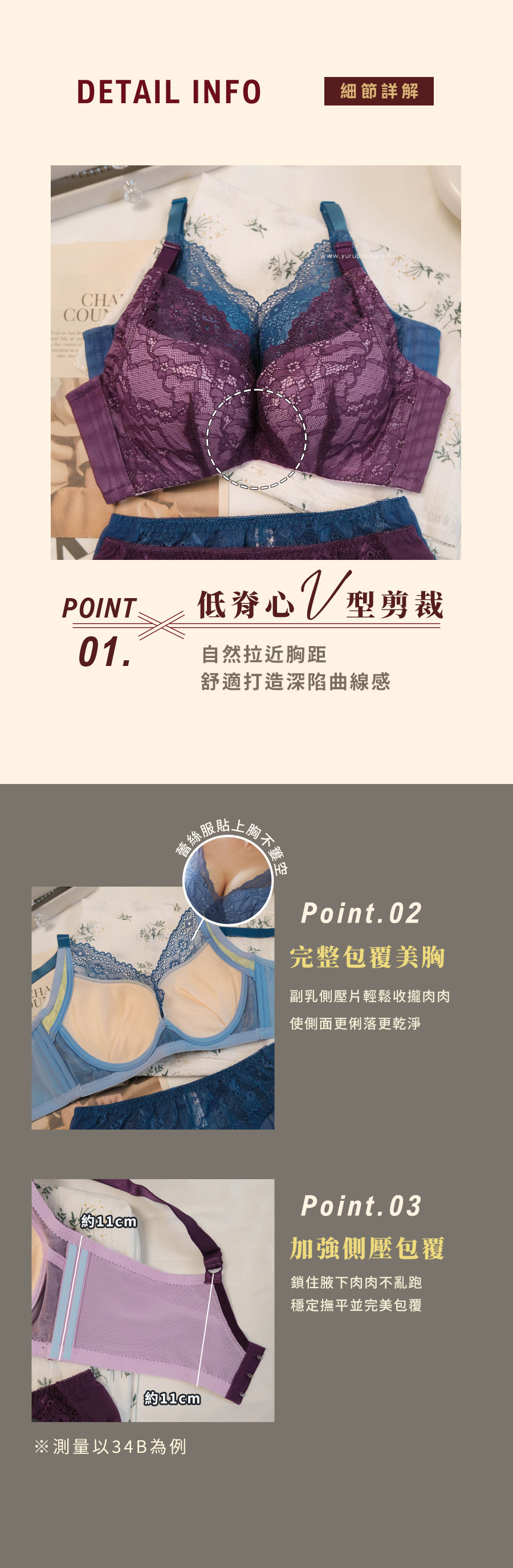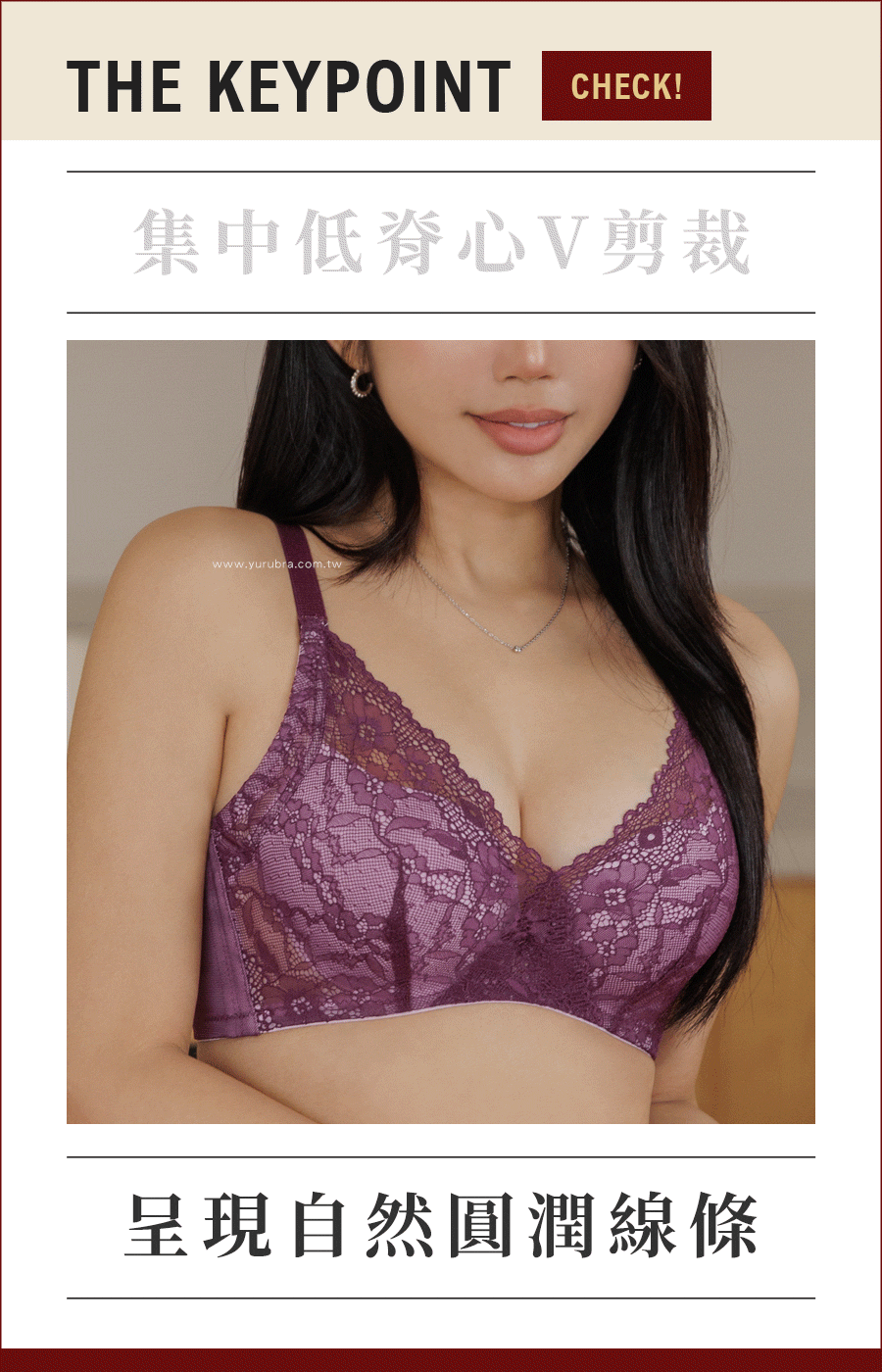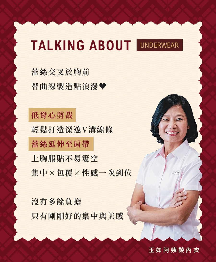 ★蕾絲在脊心做交叉設計,拉近胸距讓視覺更顯集中