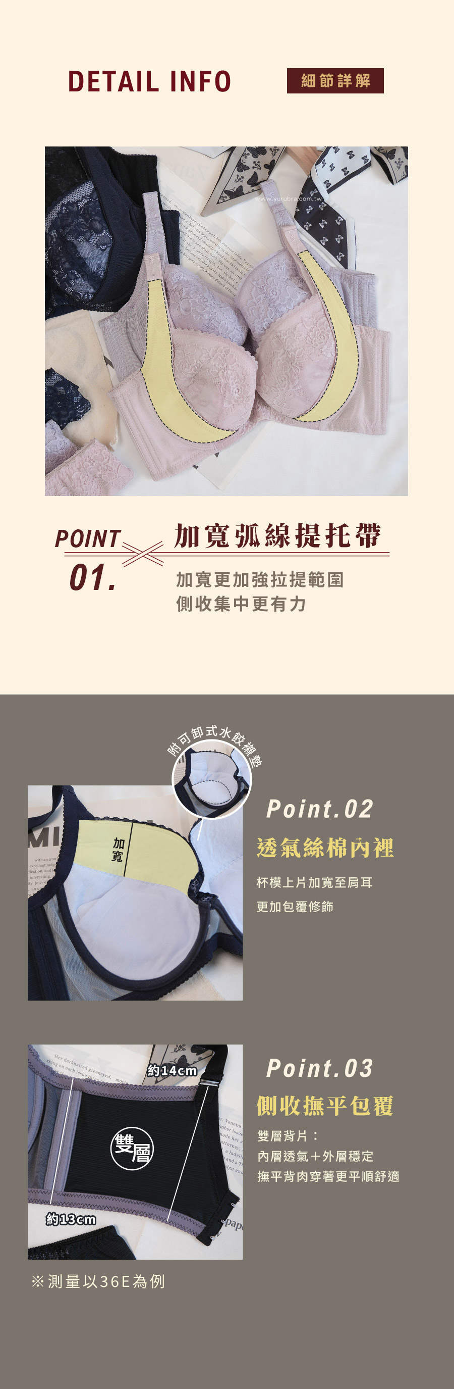 ★月牙弧形加寬外提托帶,加強胸部托高和集中感