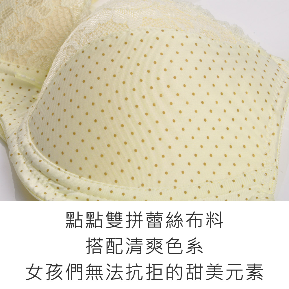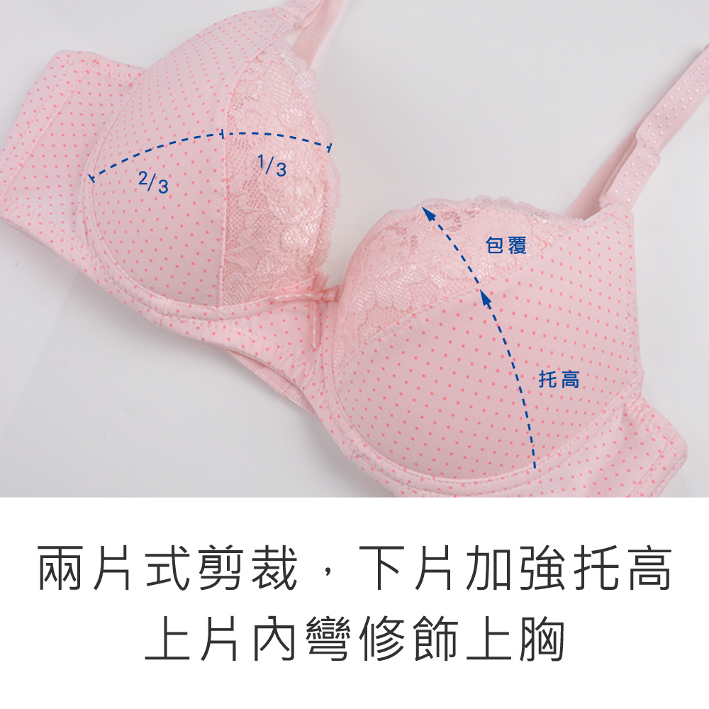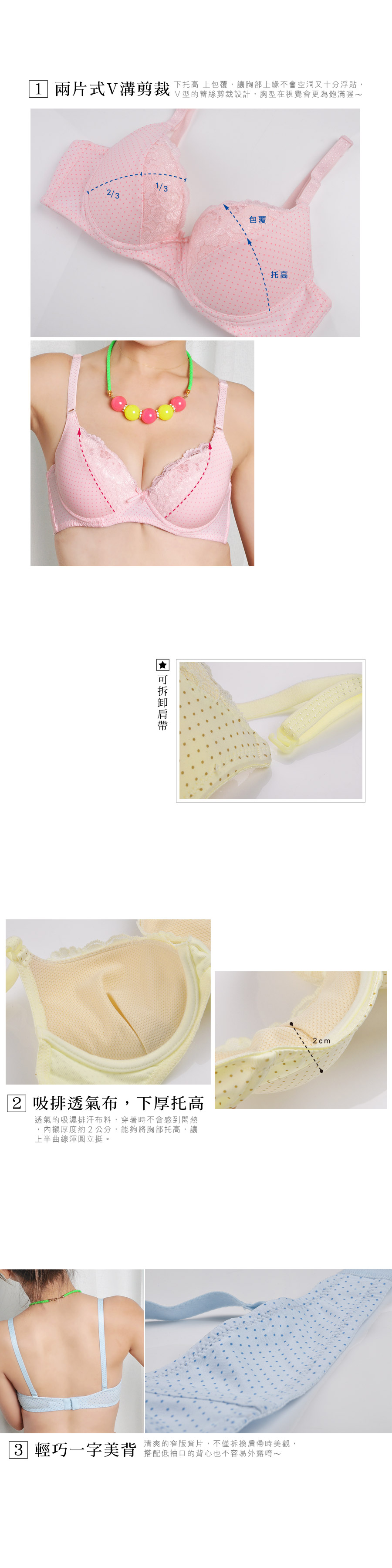 ★A罩杯專屬的輕巧型內衣,適合春夏穿著不悶熱喔~ ★點點雙拼蕾絲布料,搭配清爽色系,女孩們無法抗拒的甜美元素 ★兩片式剪裁,下片加強托高,上片內彎修飾上胸,穿起來服貼又自然 ★可拆式的肩帶設計,方便衣著搭配做變化 ★內襯採用吸排透氣布料,吸濕排汗不悶熱 ★下厚兩公分,讓上半曲線渾圓立挺 ★輕巧一字美背搭配兩排扣,窄版設計搭配低袖口背心不外露 ★台灣製造,品質保證