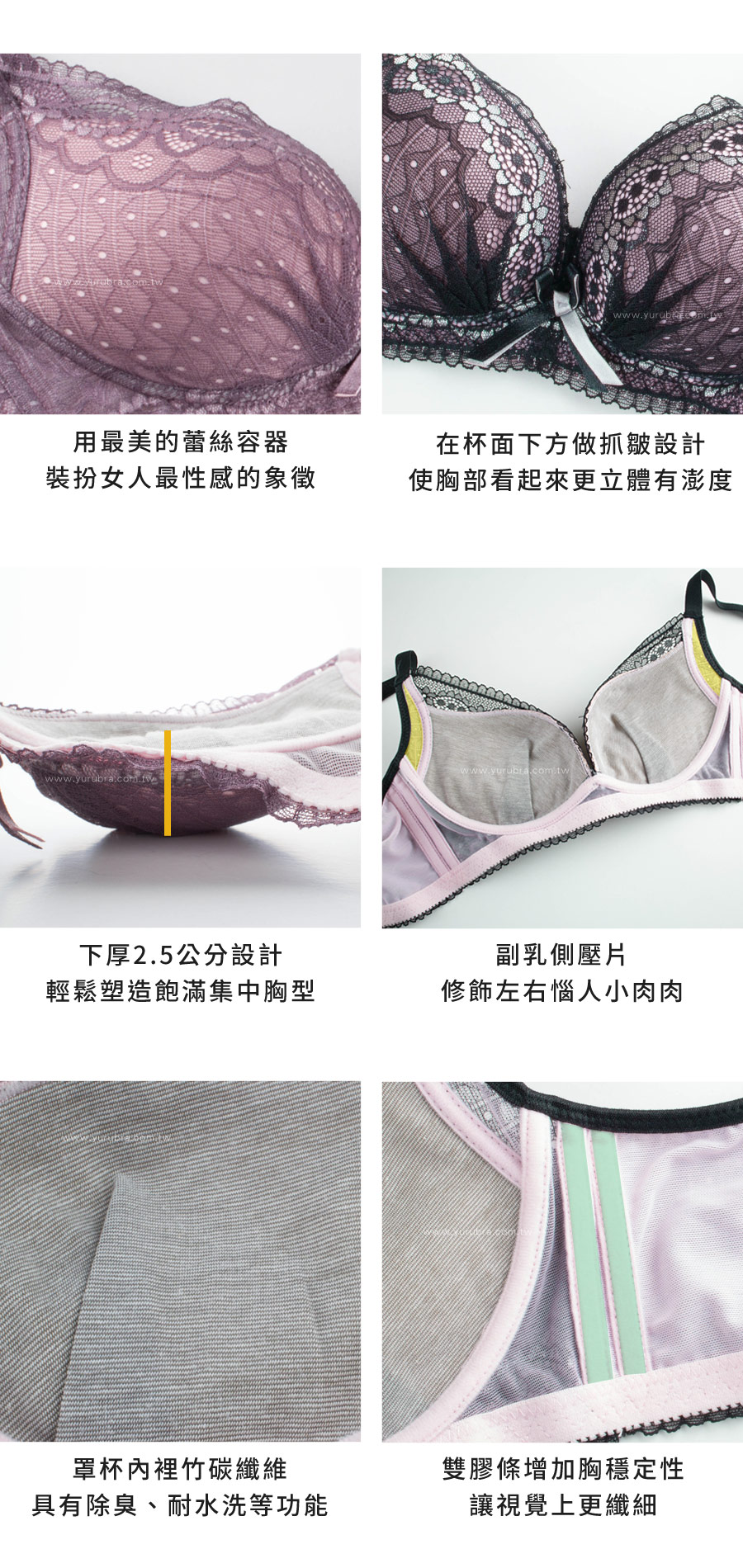 ★趕快用美美的蕾絲,裝扮妳最性感的女性象徵 ★杯面下抓皺設計,讓胸部看起來更立體有澎度 ★下厚上薄設計,讓「小山」升級至飽滿集中 ★副乳側壓片,包覆修飾左右小肉肉 ★雙膠條增加胸穩定性,讓視覺上更纖細 ★外用蕾絲包覆背部肌膚,穿起來服貼沒有束縛感 ★台灣製造,品質保證