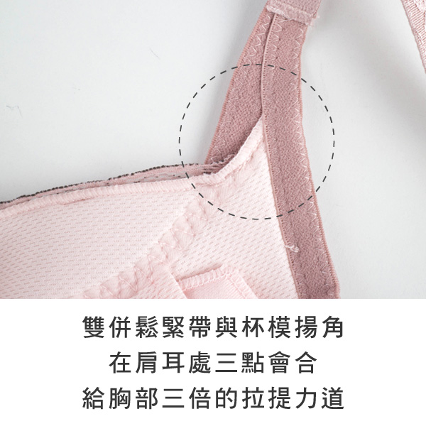 ★雙併鬆緊帶與杯模揚角,在肩耳處三點會合,給胸部三倍的拉揚力道