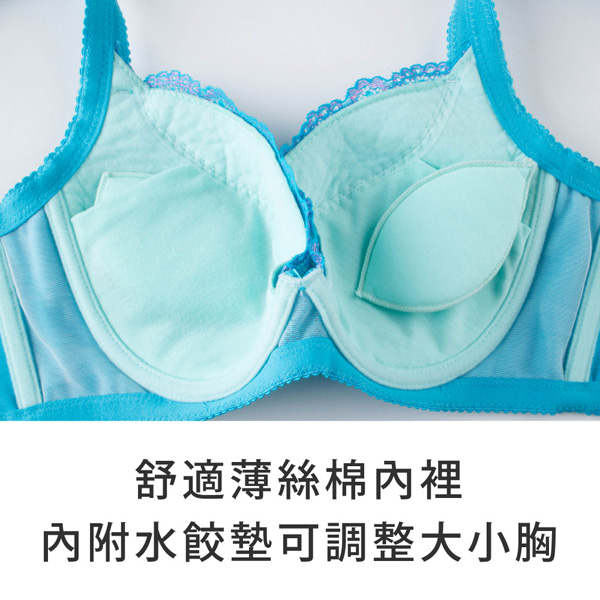 ★舒適薄絲棉內裡,內附水餃墊可調整大小胸