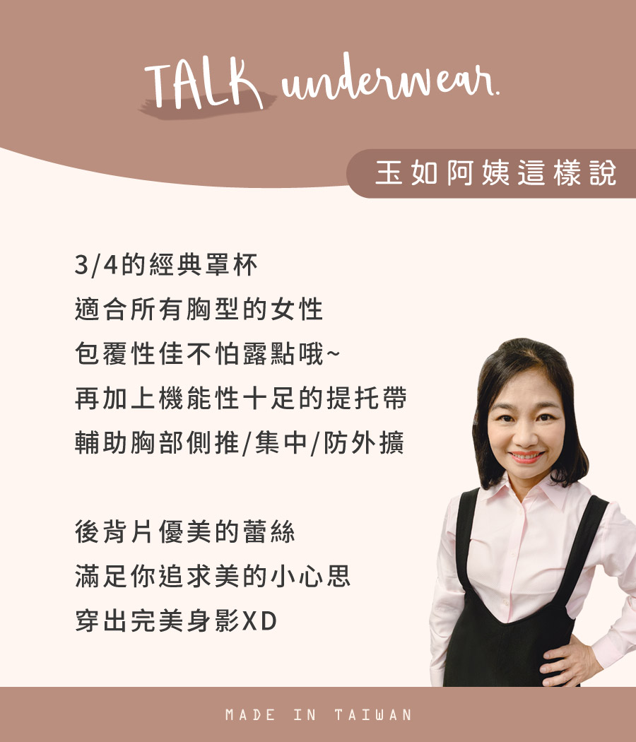 Jyue:2021-01-26 11:21:28你好,平常穿70c薄襯加水餃墊,背扣最外圍,此款選什麼尺寸合適?玉如阿姨回覆:2021-01-26 17:42:20哈囉Jyue^^