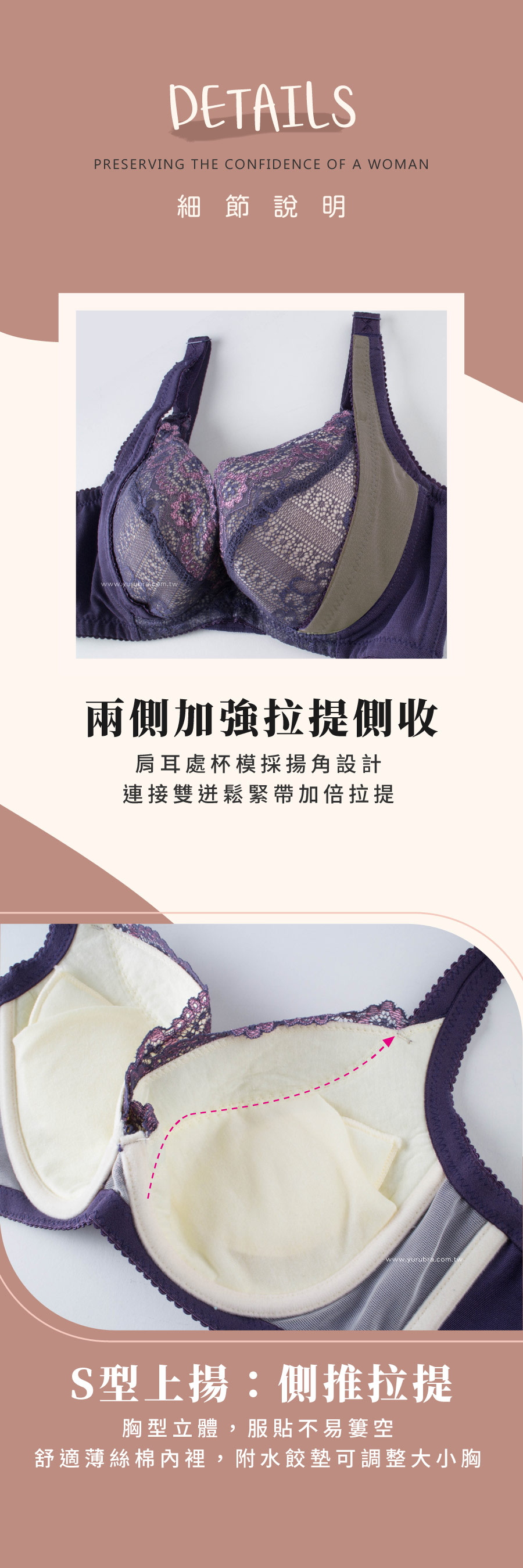 ★經典不敗版型,胸型立體不壓,打造豐滿集中胸型 ★雙側提托帶設計,加強拉提側收效果 ★S型上揚側推拉提剪裁,胸型立體,服貼不易簍空 ★舒適薄絲棉內裡,內附水餃墊可調整大小胸 ★肩耳處杯模採揚角設計,連接雙迸鬆緊帶加倍拉提 ★腋下膠條設計,穩定側邊不易走位 ★側背片加高設計,完美修飾浮肉絕不漏網 ★蕾絲美背設計,讓背影更加耀眼動人 ★台灣製造,品質保證
