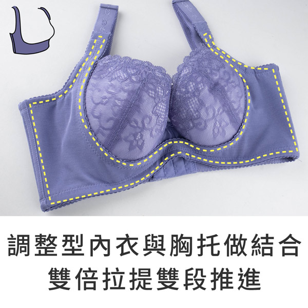 ★調整型內衣與胸托做強力結合,雙倍拉提雙段推進,造就大胸的奇蹟美胸 ★精美雕花蕾絲,鑲嵌胸前美麗雋永 ★內裡上揚剪裁與杯緣圓弧V剪裁裡外呼應,成就雙倍拉提托效果 ★腋下無彈性加壓網紗,鎖住胸肉不外移 ★可拆卸水餃墊,能輕鬆調整大小胸,隨心所欲調整乳溝深度 ★分離式的膠條設計,加強穩定推進並鎖住肉肉 ★後斜膠條:將肉肉往前推,前膠條:再次穩定胸型 ★加高雙層共560丹塑型網布,撫平穩定側背肉並雕塑身型 ★肩帶加寬2公分拉提加強,並大大降低肩膀的重壓感 ★台灣製造,品質保證