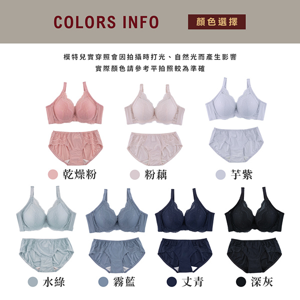 | BRA803 | 精靈交響內衣 | 粉藕,芋紫,霧藍,丈青,水綠,深灰,乾燥粉 |